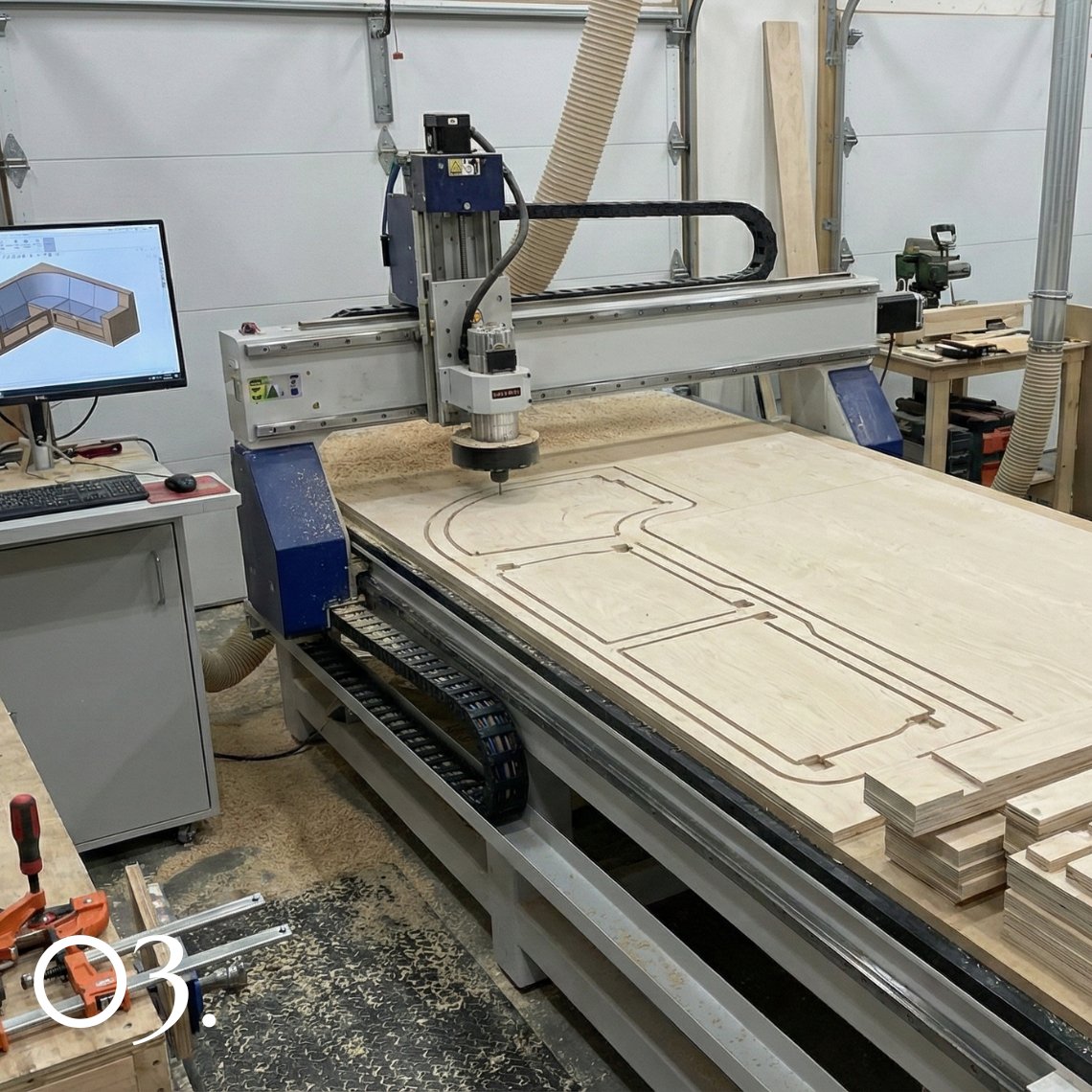 Where precision is required, components are CNC-cut to ensure accuracy and consistency across edges, openings, and profiles. Elements are then assembled and reinforced to create clean, stable forms.