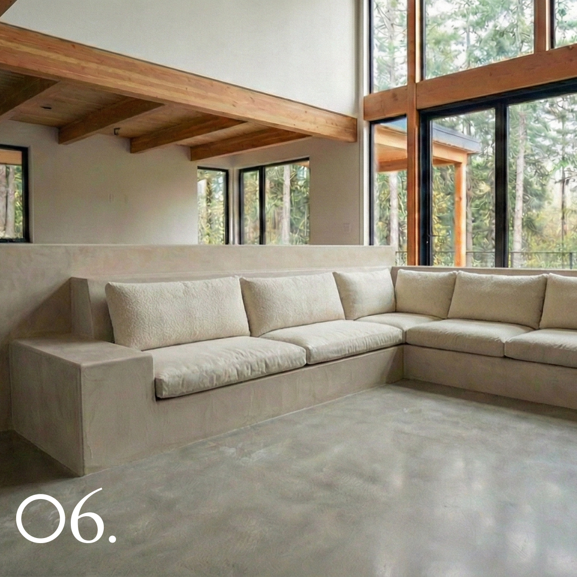 All built-ins are designed, formed, and finished in microcement, allowing surfaces to wrap seamlessly across planes and edges. Substrates are engineered specifically to support hand-applied microcement for consistent performance and finish quality.