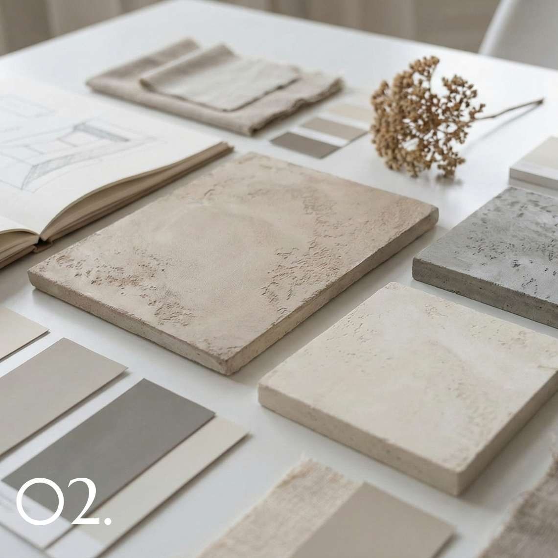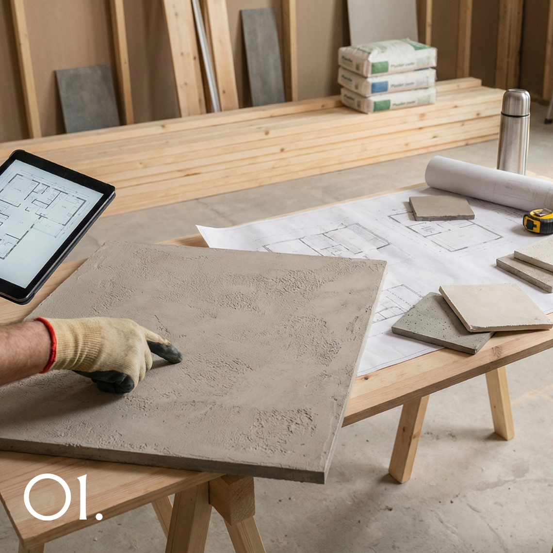 We establish a clear understanding of the space, desired tone, and material intent. We establish colour direction, surface character, and level of variation before any technical work begins.
