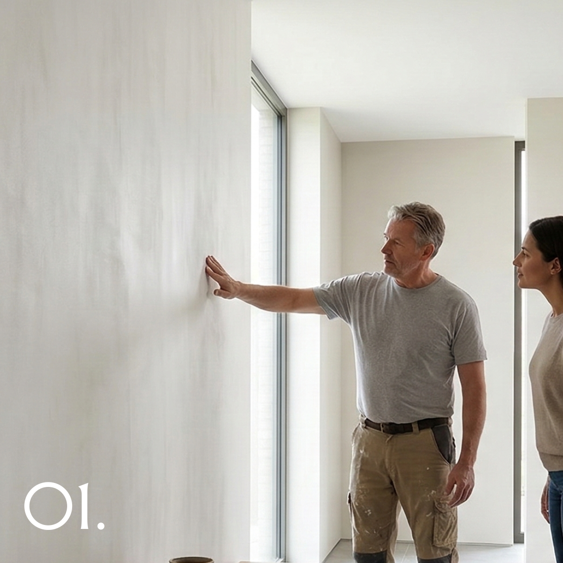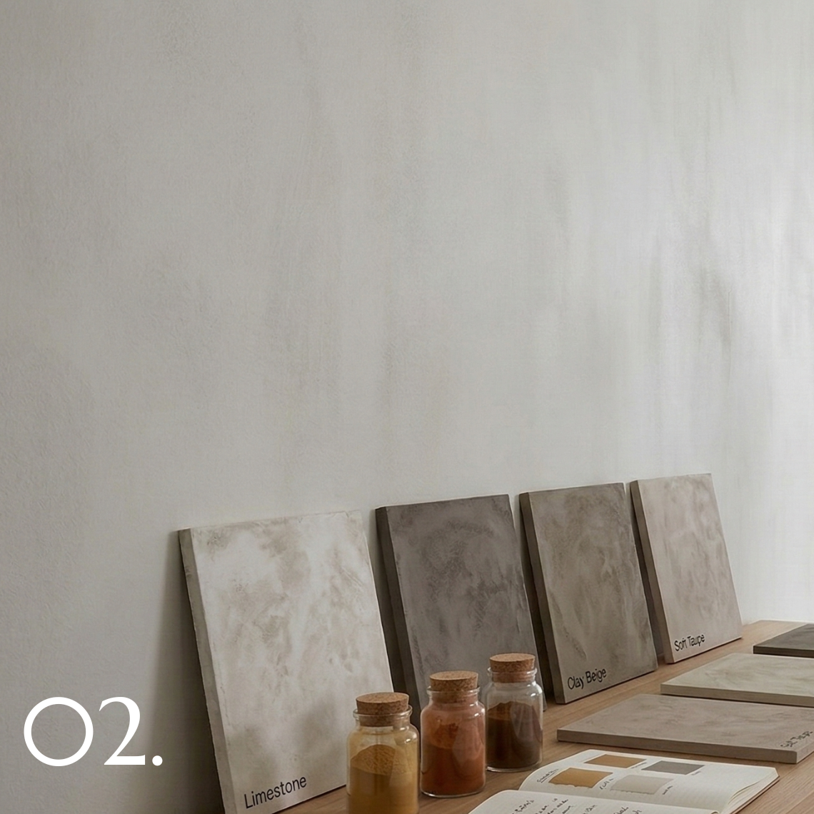 Roman Clay offers a wide range of mineral tones and levels of movement. During this stage we establish the desired colour, variation, and overall atmosphere of the finish so expectations around texture and depth are clear.