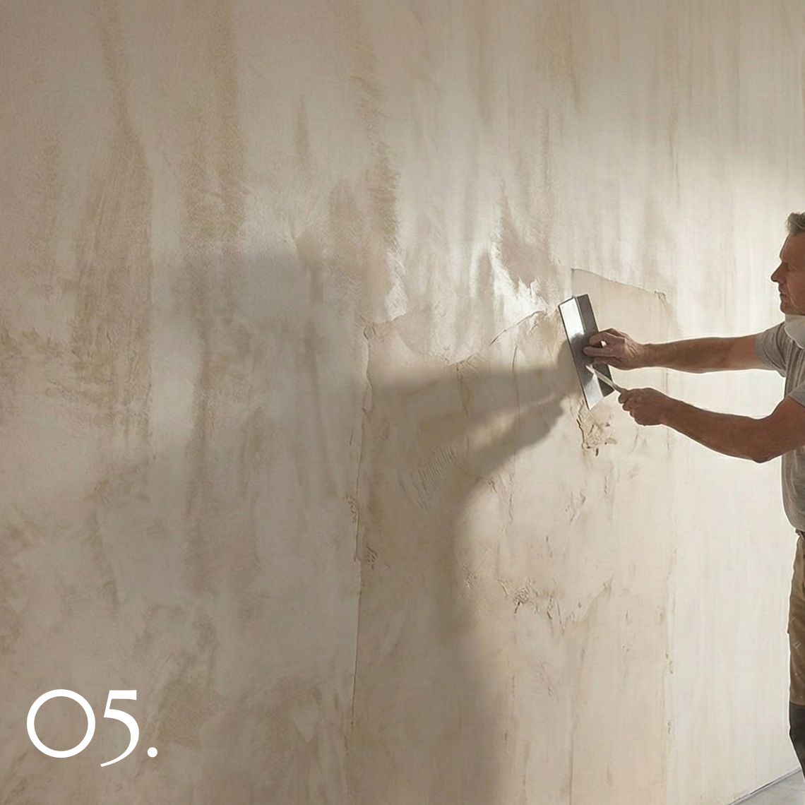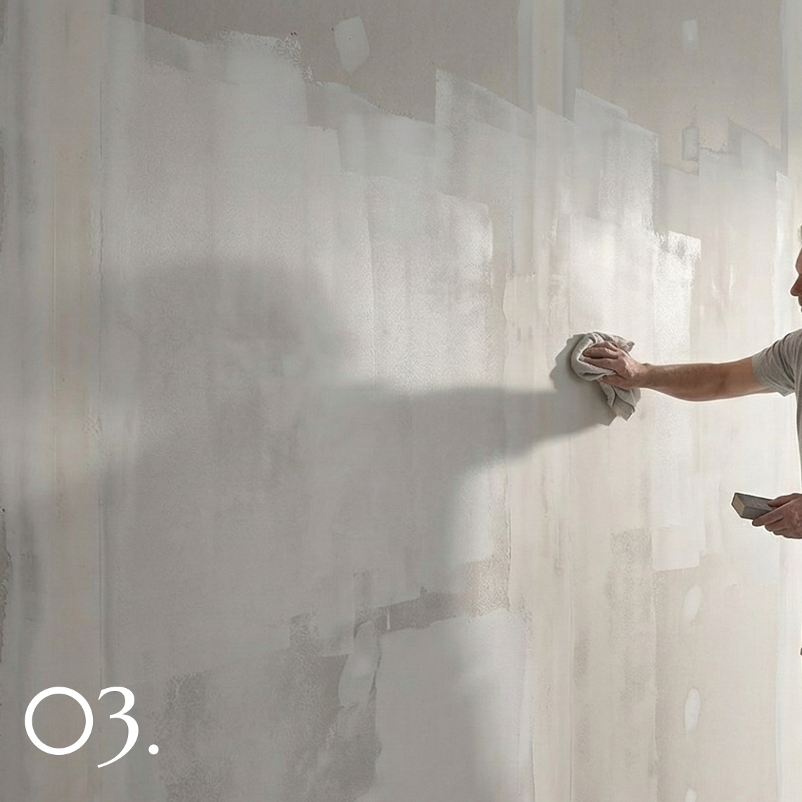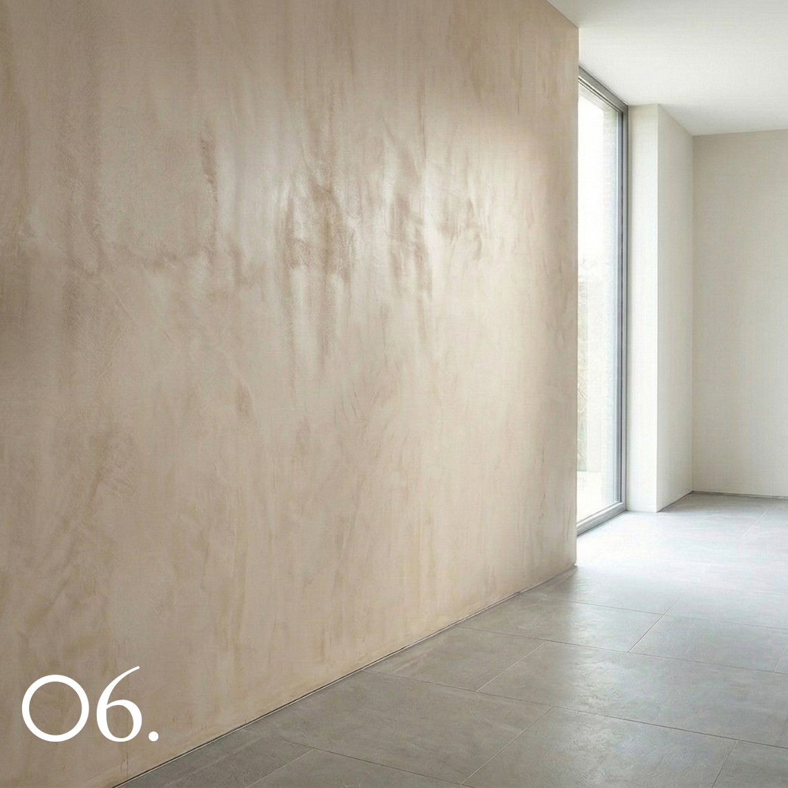 Once the desired texture is achieved, the surface is refined and allowed to cure. The final result is a calm, matte mineral wall finish that develops character through natural variation and light.